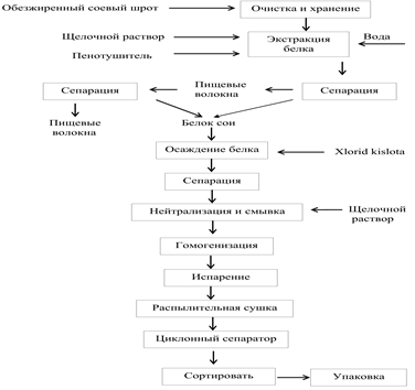Существует несколько методов извлечения белка из обезжиренного соевого шрота. Известно, что белок хорошо растворяется в щелочной среде, поэтому с учетом этого обезжиренный соевый шрот измельчают и превращают в порошок. Затем его смешивают со щелочным раствором и белок переводят в раствор. Растворенный белок отделяют фильтрацией, а белок осаждают в кислой среде путем добавления к нему минеральной кислоты. Образовавшийся осадок нейтрализуют щелочью. Затем его тонко измельчают, сушат распылением и осаждают в циклонах. Обобщая последовательность этих процессов, была создана принципиальная схема технологии получения соевого изолята (рисунок 3).