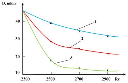 Figure 1. Variation of water globule diameters (D) as a function of the flow regime Re number during well product transfer: