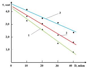 As can be seen from Figure 2 below, in all three cases of the study, the time to break up a stable water-oil emulsion decreases sharply with an increase in the diameter of the water globules. In addition, the addition of 1% surfactant (curve 2) or 3% surfactant (curve 3) requires more time to break up a stable water-oil emulsion compared to the case without surfactant (curve 1). This is explained by the fact that the introduced surfactants form smaller water globules that are difficult to sink to the bottom of the reservoirs. Therefore, the introduction of surfactants and chemical reagents into the wells, increasing their oil yield, allows you to accelerate the breakup of a stable water-oil emulsion [4; p. 124-126].