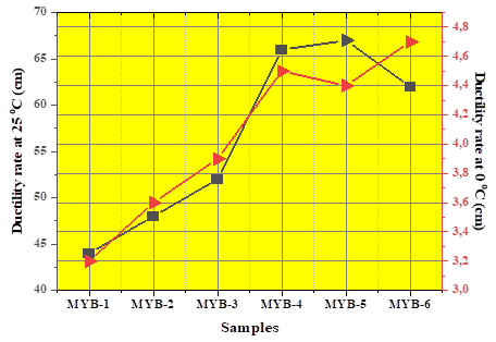 Figure 1. Ductility values of alternative road bitumen samples at 0 °C and 25 °C