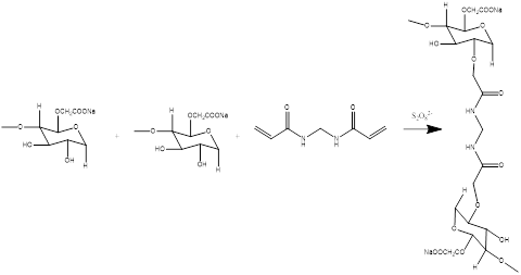 Synthesis method: First, a 5% solution of CMC was prepared and stirred continuously until completely dissolved at 70°C. The solution was then poured into a wide glass container and dried completely at 85-90°C. The resulting film was pulverized and prepared for use in hydrogel synthesis. The obtained film substance was thoroughly pulverized. Then the crushed CMC was placed in a beaker, distilled water was added in an amount of 30% of the total mass of the raw material and mixed, then neutralized with 18% sodium hydroxide solution. Neutralized mixture is heated to 70 ° C and with constant stirring added binder n,n-methylenebisacrylamide, then as an initiator added a small amount of ammonium persulfate and continue the process of stirring. One hour after the addition of the initiator, a gel-like substance begins to form, at which point a pre-crushed mixture of urea and potassium chloride is added in an amount of 18% by weight of the initial polymer, and the process continues for another 20 minutes. After completion of the process, the finished hydrogel is placed in a special container, dried to a constant mass and ready for use. One hour after the addition of the inhibitor, a gel-like substance begins to form, while 18% of the weight of the initial polymer was added from a pre-crushed mixture of urea and potassium chloride and the process continued for another 20 minutes.