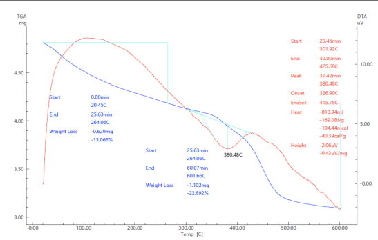 TGA and DTA analysis of the synthesized hydrogel: the crushed synthesized hydrogel was heated to 600 °C in an inert argon atmosphere and the mass loss and energy absorption were determined.