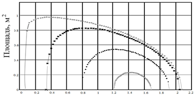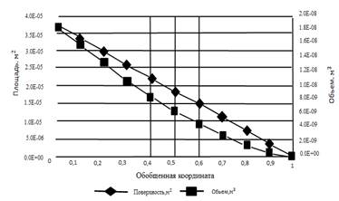 Используя приведенные данные, определяем метрические коэффициенты, входящие в уравнения. Эти зависимости получены аппроксимацией объемов изоконцентрационных поверхностей кубическими сплайнами и последующим дифференцированием их по ξ на интервале (0> ξ >1). Используемые изоконцентрационные поверхности конвективной диффузии (Рисунок 2) позволяют в этом случае свести задачу к одномерной и получить решение задачи для одномерной обобщенной координаты ξ. Исходя из уравнения, определим объем и поверхность циркуляционного тора жидкости внутри капли по известным уравнениям для тел вращения (ввиду симметрии относительно оси абсцисс интегрируем (таблица 1), (рисунок 3)