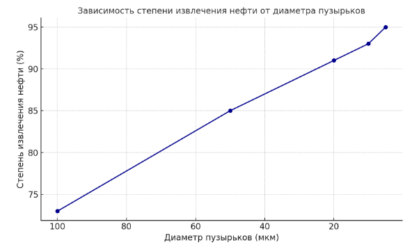 Зависимость между диаметром пузырьков и степенью извлечения нефти объясняется физико-химическими особенностями взаимодействия гидрофобных частиц с газовыми пузырьками. При уменьшении диаметра пузырьков (в диапазоне 10–50 мкм) существенно возрастает площадь соприкосновения между пузырьками и частицами нефти, что способствует более эффективному захвату углеводородов и их всплытию на поверхность. Кроме того, мелкие пузырьки имеют меньшую скорость подъёма, что увеличивает время контакта и вероятность присоединения частиц. Это подтверждено рядом исследований, включая работы Wang et al. (2023) [8] и Ahmad et al. (2021) [5], где использование микропузырьков позволило достичь извлечения до 90–95 % при оптимальных условиях.