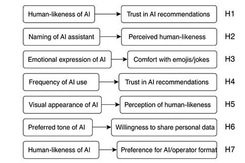 To guide the empirical investigation, seven hypotheses were formulated based on prior literature on human-computer interaction and AI trust mechanisms.