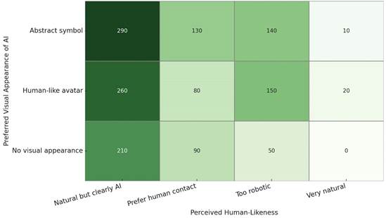 Figure 4 illustrates how users’ preference for the visual appearance of AI assistants relates to their perception of the assistant’s human-likeness. The data reveal that participants who favored a human-like avatar tended to describe AI assistants as “very natural” or “natural but clearly AI.” In contrast, those who preferred abstract visuals or no avatar at all were more likely to perceive the AI as robotic or lacking in human qualities.