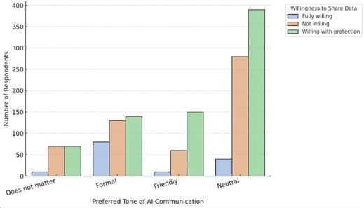 Figure 5 displays the relationship between users’ preferred tone of AI communication and their willingness to share personal data. Participants who favored a friendly tone were more likely to indicate that they were fully willing to share data for the sake of personalization. In contrast, those preferring a formal or neutral tone tended to express more caution, often selecting options such as "only with protection" or "not willing."