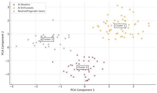 The analysis revealed three distinct groups of users. While the original survey did not include predefined categories, we derived interpretive labels based on response distributions: