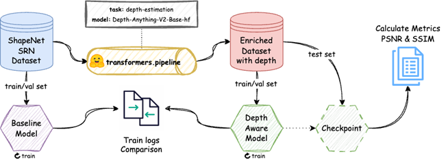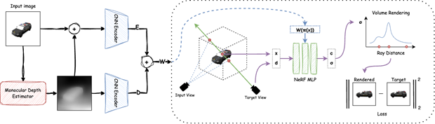 The methodology pipeline is shown in Figure 1. For our experiments, we utilize the ShapeNet dataset [2], a comprehensive repository of richly annotated 3D CAD models spanning over 3,000 object categories. Specifically, we focus on the ShapeNet Single-Category (SRN [21]) subset, which provides rendered images of objects from consistent viewpoints along with corresponding camera parameters. Following the protocol established in the pixelNeRF framework [13], we select the ”car” and ”chair” categories from the SRN subset to train category-specific models. Each object in these categories is rendered at a resolution of 128 × 128 pixels. During training, each object instance is rendered from 50 viewpoints uniformly distributed on the upper hemisphere, simulating diverse perspectives under simple lighting conditions. For testing, objects are rendered from 251 viewpoints arranged along an Archimedean spiral, maintaining the same illumination as in training. In the evaluation phase, the 64th view is designated as the input, while the remaining 250 views serve as target views for assessing novel view synthesis performance. To enhance the learning process, we precompute depth maps for each rendered image using a pretrained monocular depth estimation model. These depth maps serve as additional supervision signals, providing valuable geometric cues that guide the network towards more accurate 3D reconstructions from single-view inputs.