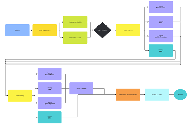 Building on these insights, this study proposes a hybrid SQLi detection framework that combines three ML classifiers — SVM, RF, and LR — using a Voting Classifier ensemble and compares their performance to a standalone CNN model. The system is trained and tested on a hybrid dataset composed of two parts: a publicly available SQL injection dataset sourced from Kaggle, and a custom collection of real-world, benign SQL queries manually extracted from a PostgreSQL environment. Model performance is evaluated based on accuracy, precision, recall and false positive rate.