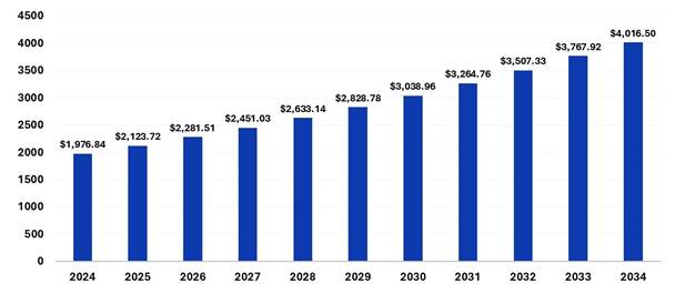 Введение. Текстильная промышленность по праву считается одной из наиболее масштабных и значимых отраслей мировой экономики. Её влияние распространяется на множество сфер, включая развитие производственного потенциала, занятость населения, внешнеэкономические связи и научно-технический прогресс. Благодаря широкому охвату технологических процессов – от переработки природного и синтетического сырья до создания конечного текстильного изделия – отрасль обеспечивает ключевые потребности различных сегментов потребительского и промышленного рынка. Современная текстильная индустрия активно использует цифровые технологии, автоматизацию и экологически чистые методы производства, что делает её важным элементом в контексте устойчивого развития и зелёной экономики. По прогнозам аналитиков, объем мирового текстильного рынка, оценивавшийся в 1,9 триллиона долларов в 2024 году, к 2034 году возрастет более чем в два раза, достигнув 4,016 триллиона долларов (рис 1) [1]. Это обусловлено увеличением спроса на качественную, экологичную и персонализированную продукцию.