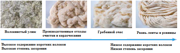 Количество и качество отходов зависят от: - свойств волокон исходного сырья (доли коротких волокон – пуха, доли пороков волокон и сорных примесей, влажности волокон и др.); - системы прядения (количества технологических переходов, массы паковок полуфабрикатов и пряжи, степени автоматизации управления технологическими процессами и вспомогательными операциями); - плана прядения (заправочных параметров оборудования); - назначения пряжи (требований, предъявляемых к качеству пряжи в отношении разрывной нагрузки, равномерности, чистоты и др.) [7].