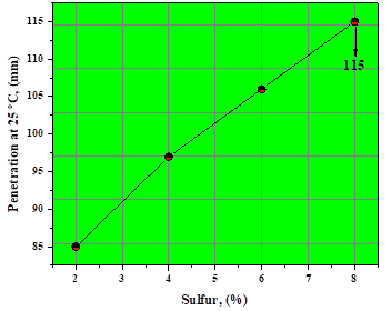 Figure 1. Penetration values of bitumen modified with different sulfur contents at 25 °C