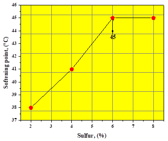 Figure 2. Softening point values of bitumen modified with varying sulfur content