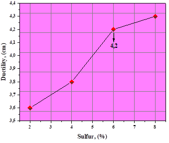 Figure 3 shows that the ductility of bitumen improves consistently with increasing sulfur content. Starting from approximately 2.1 cm at 2% sulfur, the ductility rises to 3.0 cm at 4%, 4.2 cm at 6%, and reaches 4.8 cm at 8%. This positive trend indicates enhanced elasticity and resistance to cracking under stress, which is beneficial for road performance, especially at lower temperatures. The sharp increase up to 6% suggests that sulfur effectively improves the bitumen’s stretchability, while further gains beyond this point are moderate.