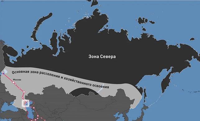 Рисунок 1. Карта Российской Федерации с показом основной зоны расселения и хозяйственного освоения территорий, трассы МТК «Север – Юг» на отрезке от Санкт-Петербурга до побережья Каспийского моря и системы малых поселений юга Астраханской области на ее периферии