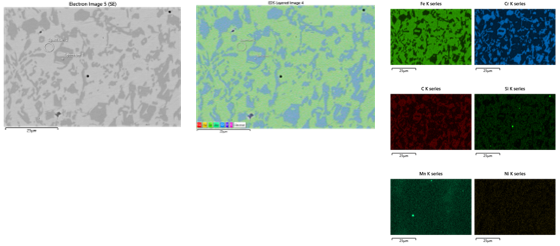 На рисунке 2, показано распределение химических элементов по поверхности материала. Согласно данным, полученным из спектрального анализа, элементы Fe, C, Cr, Mn, Ni и Si равномерно распределены в металлической матрице в следующих соотношениях: Fe — 77%, C — 10,8%, Cr — 6,9%, Mn — 3,5%, Ni — 0,9%, Si — 0,7%. В спектрах 7 и 8 установлено, что в зоне карбидов типа (Fe, Cr, Mn)₇C₃ элементы распределены следующим образом: Fe — 45,1%, Cr — 36,8%, C — 14,2%, Mn — 3,6%, Si — 0,2%. Элементы Mn и V играют важную роль в контроле роста и формирования карбидов, способствуя микроструктурной стабильности, что, в свою очередь, положительно влияет на общие свойства материала в зависимости от условий эксплуатации. Твёрдость исследуемого образца составила 56HRC, а микротвёрдость матрицы - 610HV. По результатам испытаний в условиях абразивного износа установлено, что при нагрузке 5 кг в течение 1 часа материал потерял всего 0,03 грамма массы.