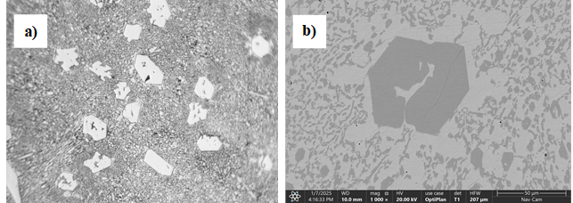 Микроструктура исследовалась с помощью оптических микроскопов Метам ЛВ-41 и Полам РП-1 с увеличением до 1000 крат, а также с применением сканирующего электронного микроскопа Apreo 2 (SEM+EDS+EBSD). Анализ проводился при напряжении 20 кВ и увеличении 200X–10kX, включая ионную полировку для улучшения качества изображений. Твердость измерялась по методу Роквелла (ГОСТ 9013-59) при нагрузке 1457 Н, а микротвердость - прибором Mitutoyo HM-200 при нагрузке 300–1000 г. Износостойкость оценивалась на лабораторной установке по ГОСТ 23.208–79.