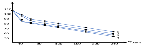 Рисунок 1. Зависимость глубины гидрирования хлопкового масла от времени контакта с катализаторами № 1, № 2, № 3 и № 4