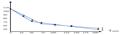 Рисунок 2. Зависимость глубины гидрирования хлопкового масла от длительности его контакта на катализаторах № 1 и № 2