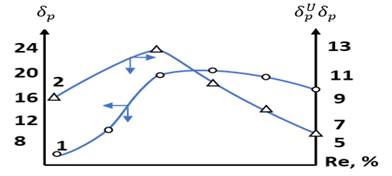 Рисунок 3. Зависимость промотирующего (1) и удельно промотирующего (2) эффектов от количества рения в никель-медь-родий-алюминиевом катализаторе