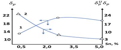 Рисунок 4. Зависимость промотирующего (1) и удельно промотирующего (2) эффектов от количества олова в никель-медь-родий-алюминиевом катализаторе