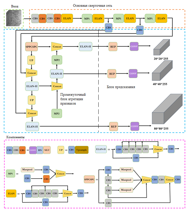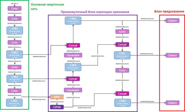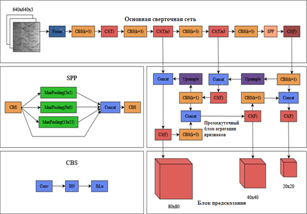 Данная модель состоит из трех основных компонентов: основной сверточной сети, промежуточного блока агрегации признаков и «головы». Основная сверточная сеть архитектуры состоит из набора сверточных нейронных сетей, дополненных специализированными модулями C3 и SPP, отвечающими за выделение ключевых характеристик изображений. Центральный компонент системы преобразует визуальные данные в векторное представление, объединяя пространственные параметры (ширину и высоту) с канальными измерениями, что существенно ускоряет процесс извлечения признаков. Промежуточный блок агрегации признаков реализует сеть объединения признаков. «Голова» выполняет функции прогнозирования, генерируя через последовательность сверточных преобразований три набора векторов признаков, содержащих распознанные категории и вероятность успешной категоризации. Схема данной архитектуры представлена на рисунке 1.