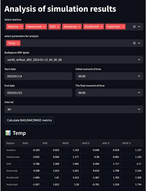 To assess the accuracy of WRF model simulations, the developed web application includes a module for statistical comparison of modeled air temperature with observational data. Figure 1 presents key verification metrics BIAS, MAE, and RMSE calculated both at weather station locations and averaged over a 3×3 grid surrounding each station. This enables objective evaluation of model performance and selection of optimal parameterizations.