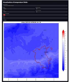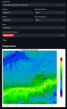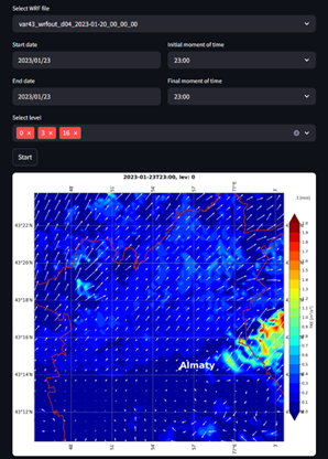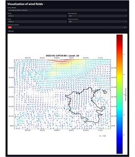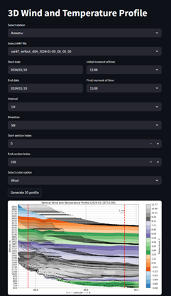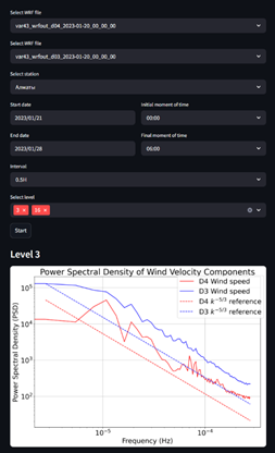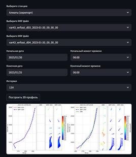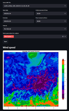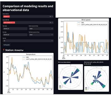 The developed web application enables interactive analysis and visualization of atmospheric modeling and observational data, with a focus on automation and usability. Built with Streamlit, it runs in a web browser and does not require specialized installation. The system supports WRF output in NetCDF format and meteorological observations in CSV, TXT, or Excel files.