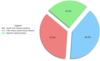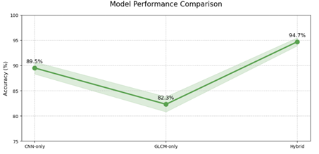 The suggested hybrid model was tested on a curated subset of the EuroSAT dataset and assessed against both conventional texture analysis techniques and standalone deep learning architectures. The findings support that the hybrid model demonstrates clear superiority by effectively combining CNN-based features with statistical texture descriptors [17][18].