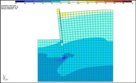 Для определения основных принципов и выявления особенностей моделирования конструкций заглубленного здания, взаимодействующих с грунтовым массивом, рассмотрена задача взаимодействия подпорной стены с грунтом (рис. 1). Численная модель данной задачи представлена на рисунке 2 (рассматривался случай плоской деформации). При этом варьировались как геометрические размеры конструкции, так и жесткостные характеристики. Напряженно-деформированное состояние конечно-элементной модели подпорной стены представлено на рисунке 3.