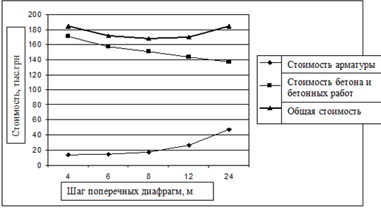 Рисунок 5. График зависимости стоимости арматуры, бетона, бетонных работ и общей стоимости бетона и арматуры от шага поперечных диафрагм