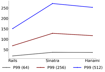 Figure 2. P99 latency analysis for Ruby on Rails, Sinatra, and Hanami under different load conditions, ms