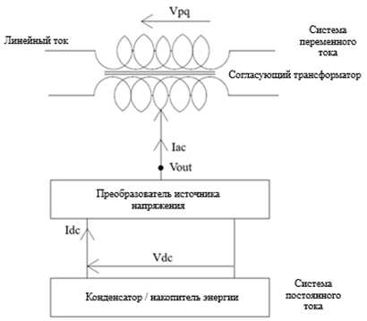 Функциональная модель SSSC представлена на рисунке 2, где устройство для хранения энергии заменило конденсатор постоянного тока, аналогично установке аккумулятора высокой мощности для обеспечения обмена как активной, так и реактивной мощностью с системой переменного тока. Как угол, так и величина выхода SSSC могут изменяться для управления потоком мощности в линиях электропередачи. Активная и реактивная мощность могут обмениваться с системой путем изменения фазового угла вводимого напряжения (Vpq ) относительно тока линии передачи энергии (Iline).