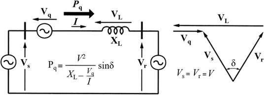 В приведенном выше уравнении показано, что SSSC может либо усиливать, либо регулировать передачу активной мощности, изменяя вводимое напряжение (Vq) между положительными и отрицательными значениями. Направление потока мощности меняется, если Vq превышает падение напряжения на реактивном сопротивлении неконтролируемой линии электропередачи (XL ), что приводит к потоку мощности от приемного конца к отправляющему [5, с. 71-81].