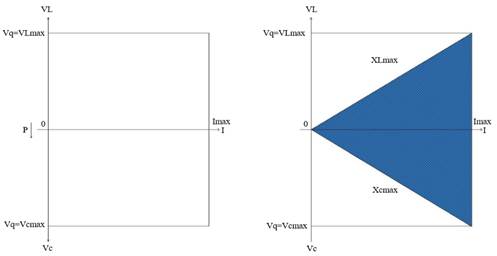 Типовой источник напряжения преобразователя VSC позволяет SSSC обеспечивать емкостную и индуктивную компенсацию напряжения, независимо от тока линии. Когда ток линии меняется в пределах от нуля до Imax, SSSC может поддерживать номинальное максимальное емкостное или индуктивное компенсирующее напряжение. Для индуктивной и емкостной областей рабочие характеристики SSSC изображены на рисунке 6.