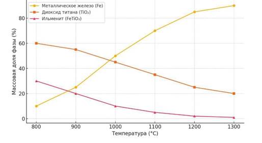 Рисунок 2. Схематическая фазовая диаграмма, отражающая изменение массовых долей основных фаз при повышении температуры восстановления титаномагнетитовых руд