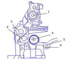 1-ворсовый барабан, 2-выпрямитель, 3-пильный барабан, 4-щеточный барабан, 5-ячеистая поверхность, 6-сеточный шнек.