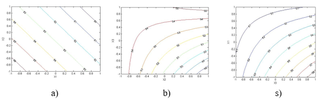 В результате исследования были построены графики, показывающие влияние каждого входного фактора в уравнении регрессии, которое адекватно описывает эффективность отделения примесей из ворсового состава U1 путем формирования очистного устройства, объединяющего щеточный барабан, направляющую и сетчатую поверхность (рисунок 2):