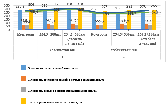 - улучшение биометрических показателей: в вариантах с применением УФ-облучения (УФО) высота растений, количество початков и масса 1000 зёрен были значительно выше по сравнению с контрольной группой. У сорта «Узбекистан 601» высота растений достигла 318 см, у сорта «Узбекистан 300» – 288 см, что на 14–16 % больше, чем в контроле.