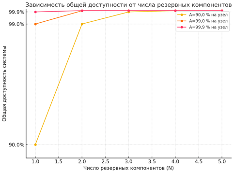 Аппаратное резервирование также включает избыточное питание (ИБП, генераторы), сетевые каналы от разных провайдеров, RAID-массивы для хранения данных и т.д. Идеология “делай всё дублированным” широко применяется в промышленных системах реального времени и дата-центрах. При идеальных условиях добавление N одинаковых независимых компонентов с доступностью A теоретически повышает общую доступность по формуле [9]: