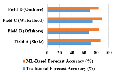 The consistent accuracy advantage also highlights the scalability of ML forecasting. Once trained, ML models can be applied to multiple wells or fields with minimal adjustments—supporting large-scale deployment in digital oilfields. Improved forecast precision enables better operational planning, reduced uncertainty in production estimates, and enhanced financial projections.
