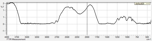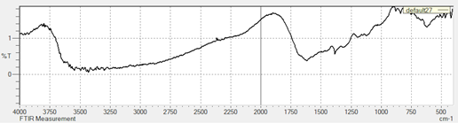 Центральные характерные области: ~3400–3200 см⁻¹ — широкая полоса — соответствует валентным колебаниям связи N–H. В сополимере могут присутствовать остаточные первичные/вторичные амины, ~2950–2800 см⁻¹ — полосы средней интенсивности — это валентные колебания связи C–H в группах –CH₂–, подтверждающие наличие метиленовых мостиков из формальдегида, ~1650–1550 см⁻¹ — полоса деформационных колебаний связи N–H (ножницы) и колебаний связи C=N. Может указывать на образование имино- или азометиновых связей (–CH=N–), если произошла конденсация, ~1450–1300 см⁻¹ – деформации C–H (в метиленовых группах) и колебания C–N, ~1250–1000 см⁻¹: колебания C–N, C=N, а также деформации связей в гуанидиновых и иминоформах, ~900–500 см⁻¹: это зона «отпечатков пальцев», характерная для деформаций скелета молекулы. Здесь могут находиться колебания, соответствующие конкретной структуре полимера, в том числе метиленовые колебания. В ИК-спектре наблюдается: наличие аминогрупп (N–H), образование метиленовых мостиков (C–H ~2900 см⁻¹), возможное образование иминогрупп (C=N), явное отличие от спектра чистого аминогуанидина (уменьшение интенсивности в области 3400 см⁻¹ и появление новых полос при 2900 и 1400 см⁻¹). Это подтверждает образование сополимера аминогуанидина с формальдегидом.