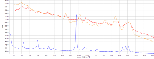 На графике показаны спектры комбинационного рассеяния трех образцов: исходного гидрохлорида аминогуанидина (синий спектр) и двух его сополимеров с формальдегидом (красный и желтый спектры).