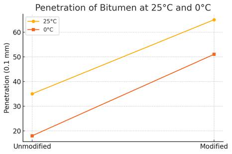 - At 25 °C, the penetration value increased from 35 (0.1 mm) in the unmodified sample to 65 (0.1 mm) after modification.
