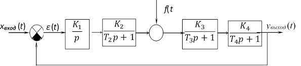 K1=2, K2=2.5, K3=2, K4=1 коэффициенты усиления, T2=0.002, T3=0.2, T4=0.002 постоянная времени.