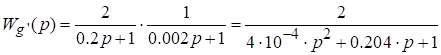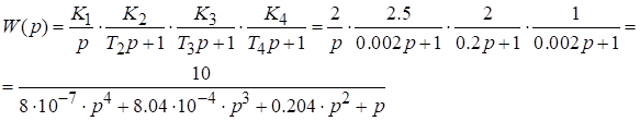 Теперь, используя приведённые значения (коэффициенты усиления: K1=2, K2=2.5, K3=2, K4=1; постоянные времени: T2=0.002, T3=0.2, T4=0.002 рассчитываем общую передаточную функцию после возмущающего воздействия (11).