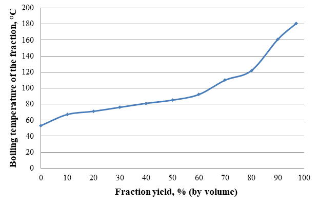 Conclusion. The conducted studies on the fractional composition of pyrocondensate and the separation of low-boiling solvents allowed for identifying an effective solvent applicable in the oil industry. Fractional distillation yielded a fraction boiling within the 53–85 °C range, whose physicochemical properties were found to be close to those of benzene. In particular, its low density, high vapor pressure, and good solubility demonstrated the suitability of this fraction as a solvent for dissolving hydrocarbons.