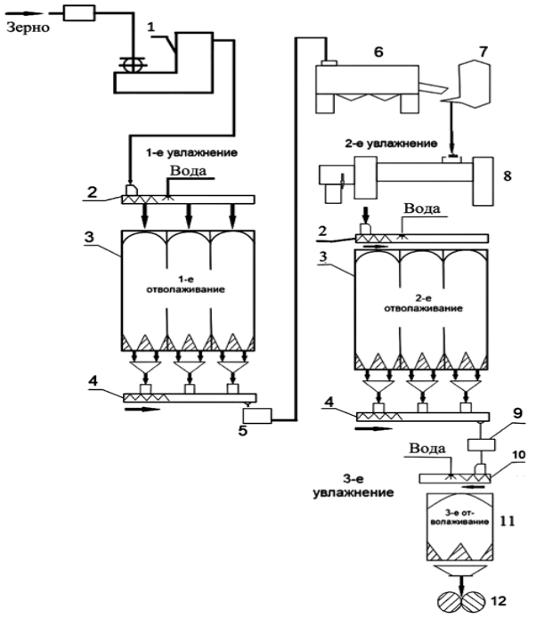 1 – мойка зерна; 2 – распределительный шнек; 3 – I-ая- II-ая- отволаживания; 4 – шнек-смеситель; 5 – прибор для определения влажности; 6 – горизонтальная обоечная машина; 7 – пневмосепарирующий канал ; 8 – увлажнителный апарат; 9 – весовой дазатор; 10 – шнек-смеситель; 11 – III-ая отволоживания 12 I ДР.С.