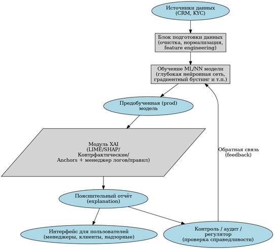 Присутствие блока «Обратная связь (feedback)» — ключевой элемент итерационного процесса. Менеджеры и аналитики, получая жалобы клиентов или замечания регуляторов, могут корректировать как базовую модель, так и правила XAI (например, уточнять пороги для контрфактических изменений или обновлять шаблоны пояснительных сообщений). Тем самым XAI не только даёт снимок причин текущего решения, но и помогает адаптировать систему принятия решений к новым рыночным условиям и ожиданиям общества.
